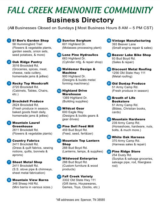 Fall Creek Mennonite Community outside of Pikeville, Tenn., is home to some 60 families and 25 Mennonite owned and operated businesses. While visiting. you’ll find a little bit of everything, including fresh produce, baked goods, flowers and vegetable plants, custom furniture and wood products, dress and quilt fabrics, gift items, and more. Plan your trip and come experience their old-world way of living.